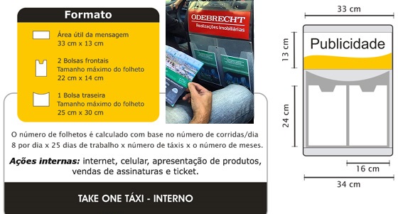 O Display Porta-Folhetos é mais uma opção de mídia inteligente. Ele permite uma ação integrada com o passageiro que, desta maneira, além de ler a mensagem, pode conferí-la ao vivo através de exemplos como CDs, amostras grátis para degustação, propostas de assinatura, etc. São mais de 400 pessoas por táxi durante o mês que levam consigo a sua mensagem.