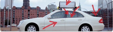 Anuncie nos vidros traseiros de táxis e aproveite a ótima exposição da mídia devido ao longo tempo em que o táxi fica no trânsito. Você estará impactando tanto o público de outros veículos como os pedestres, atingindo altos índices de recall.
